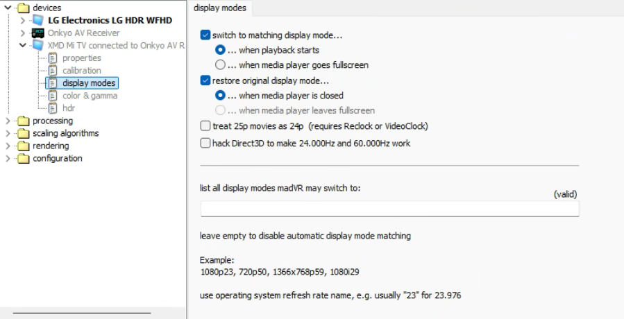 允许madVR切换屏幕为以下模式,格式 (宽度)x高度p/i刷新率,刷新率需要为系统内显示的刷新率