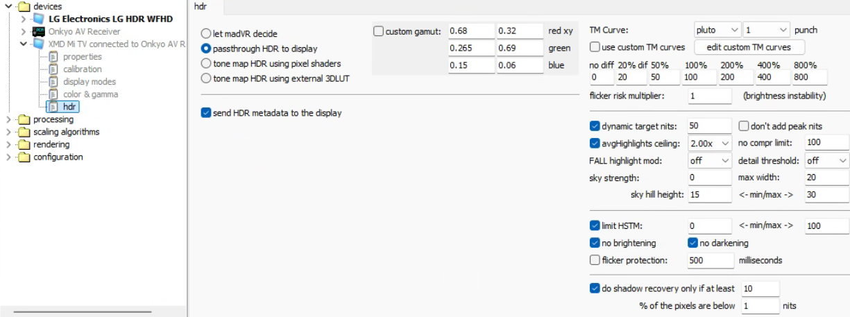 让madVR选择/直通HDR/使用pixel shaders映射HDR/使用外部LUT映射HDR