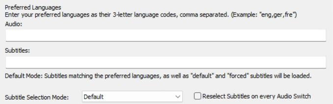 偏好的语言:用ISO 639-2三字母代码代表一种语言,逗号分隔,Audio和Subtitiles分别代表偏好的音频和字幕语言,按个人习惯输入即可。