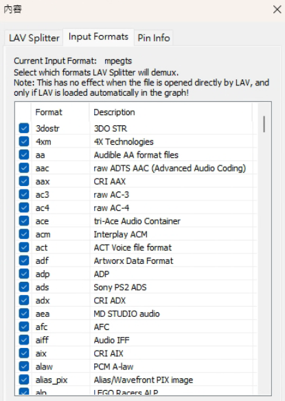 选择要让LAV Splitter处理的格式,全选即可,可以看到目前正在处理的封装格式。
