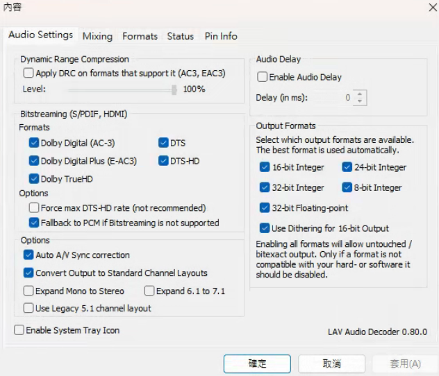 输出格式:LAV Audio Decoder向下一个滤镜输出的格式,全选即可。