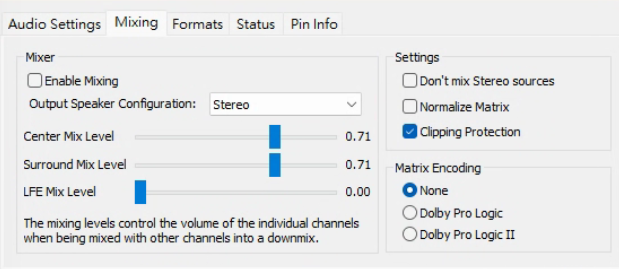 混音器:用于将多声道音频上下混,如果你是用AVR/电视的则一般不需要,它们会自己执行这个行为,只有你在使用Windows直接多声道接输出音箱/耳机的时候才需要。