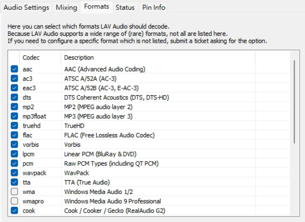 选择要让LAV Audio Decoder处理的格式,全选即可。
