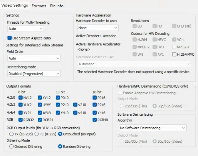 输出格式:全选即可,RGB范围Untouched,尽量不要使用LAV任何的处理,交给madVR即可,抖动就可以不用管了,全选的话LAV不会抖动处理。