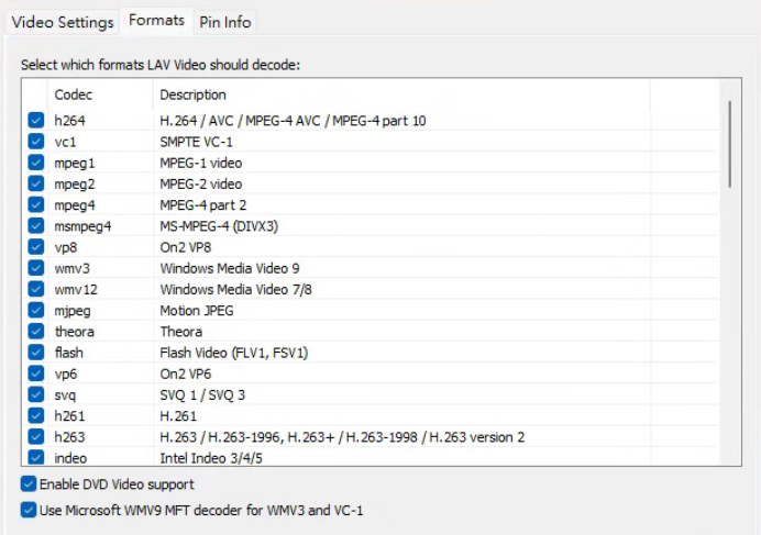 选择要让LAV Video Decoder处理的格式,全选即可。