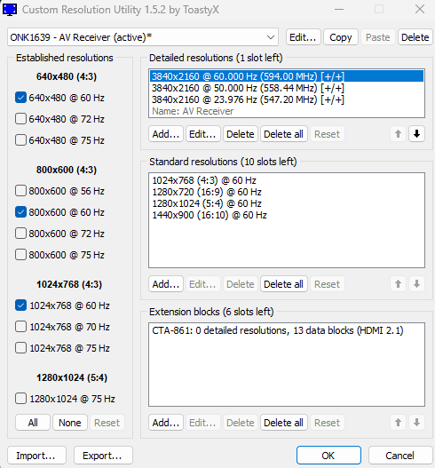 首先打开CRU,左上角选你需要调整的显示器,左下角可以Export一下显示器原本的EDID(非必须,可以手动还原)。看到中间,左边一排分辨率的按钮不用管,没啥用,右边上面就是这篇文章的重点,中间也是加分辨率用的,不过这里只负责存储不详细的分辨率信息,可以不用管,下面是HDMI额外的信息块,负责存一些链路的信息,支持的动态范围,音频效果等,先不用管。