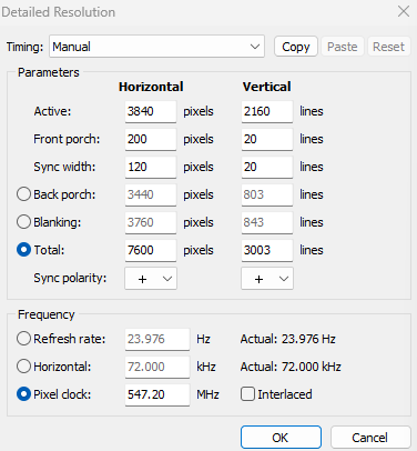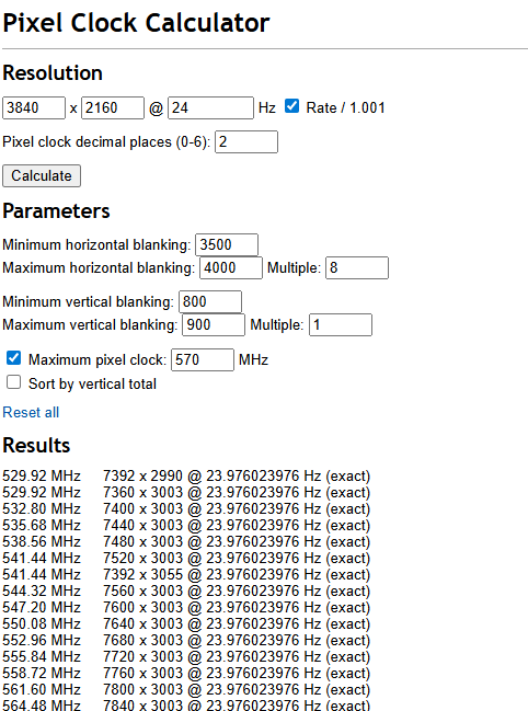 下面的参数就比较关键了,首先确定你的显示器时钟在多少MHz附近比较稳,我这个就是550左右,实际情况还是要看你自己测试和显示器原本的EDID确定。确定好之后+20/30左右填到Maximum pixel clock并打勾,两个Multiple不用管,调min/max horizontal/vertical blanking,计算多几次,直到Results里面的结果和你的显示稳定的时钟比较接近,而且最后有exact的,随便选一个,时钟填到CRU的Pixel clock,计算出来的分辨率填到Total,不用管后面的刷新率。